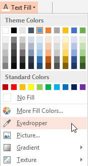 Select the word(s) you want to animate separately and click the Format tab under Drawing tools. Click on the Text fill button in the WordArt styles group and finally select Eyedropper.