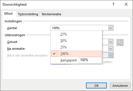 The procedure is identical to the one described above.Select the shapes in the order you want them to appear (shift+click). Add the emphasis animation 'Transparency' using the Animation tab and the Add animation button. Right click the selection and on the Effects tab of the dialog increase the default transparency percentage from 50% to 100%.
